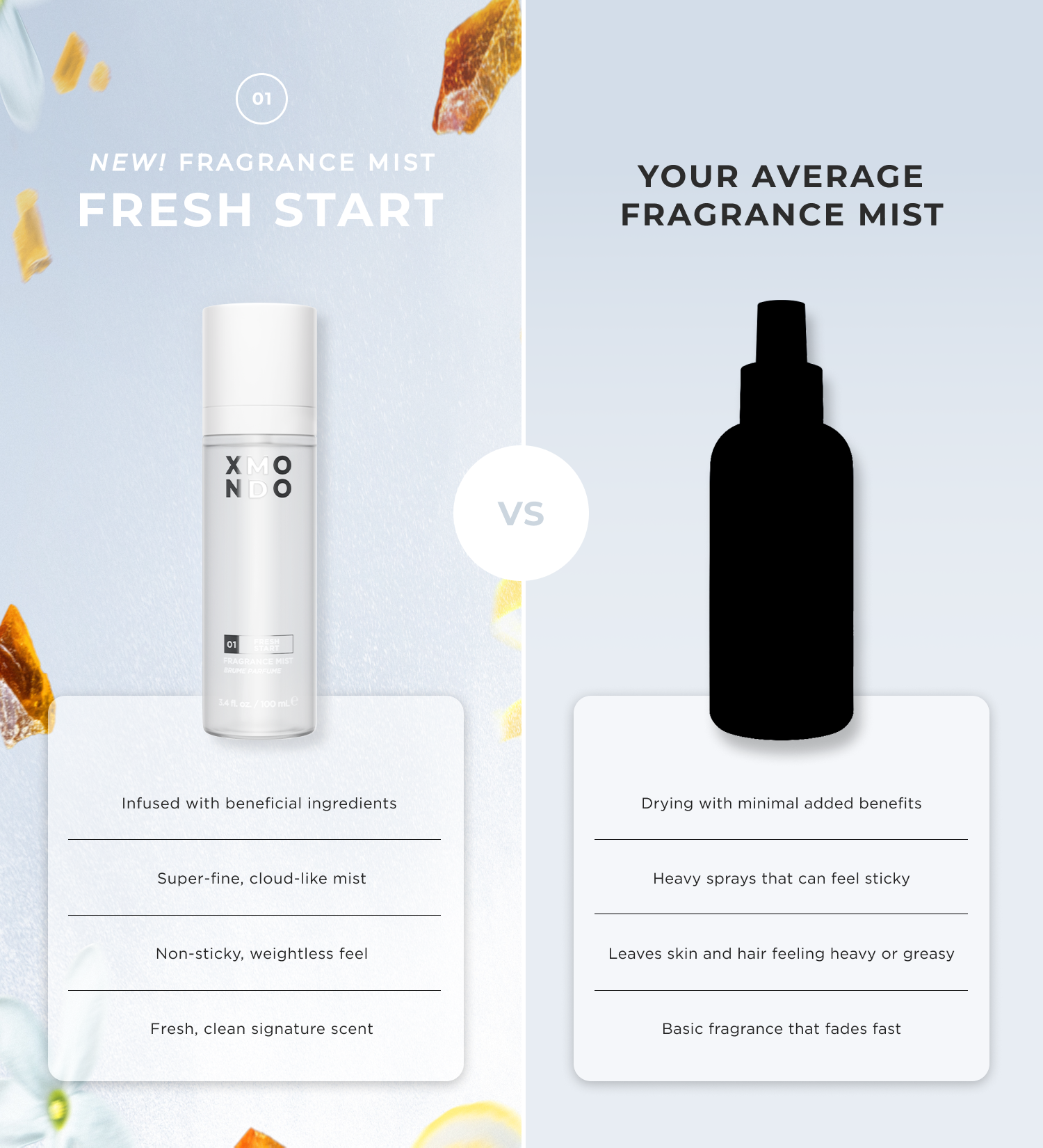 • Fragrance Mist delivers XMONDO's signature scent plus hyaluronic acid for lightweight moisture.