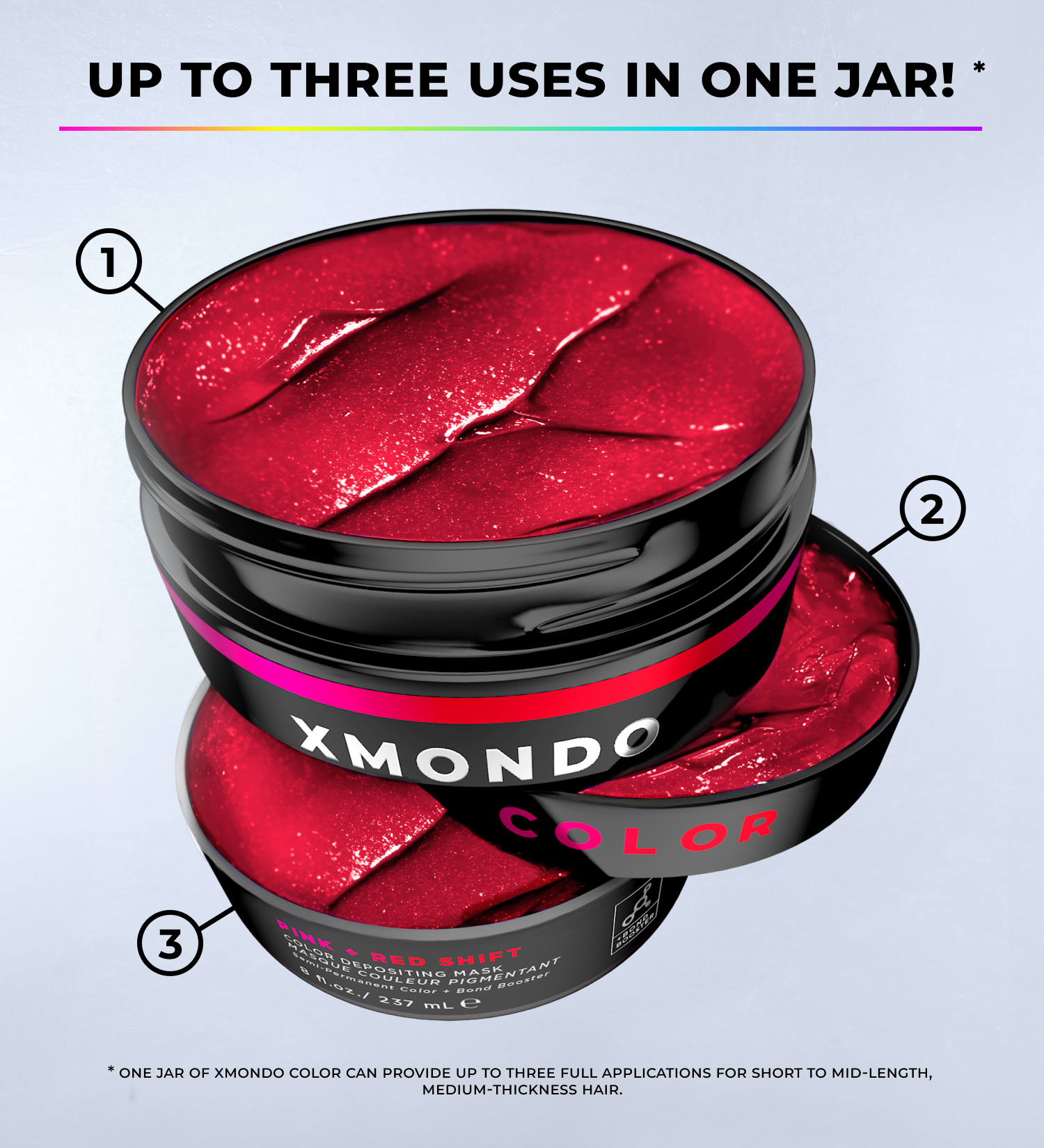 One jar of XMONDO Color typically gives 2-3 applications, depending on your hair’s length and thickness.