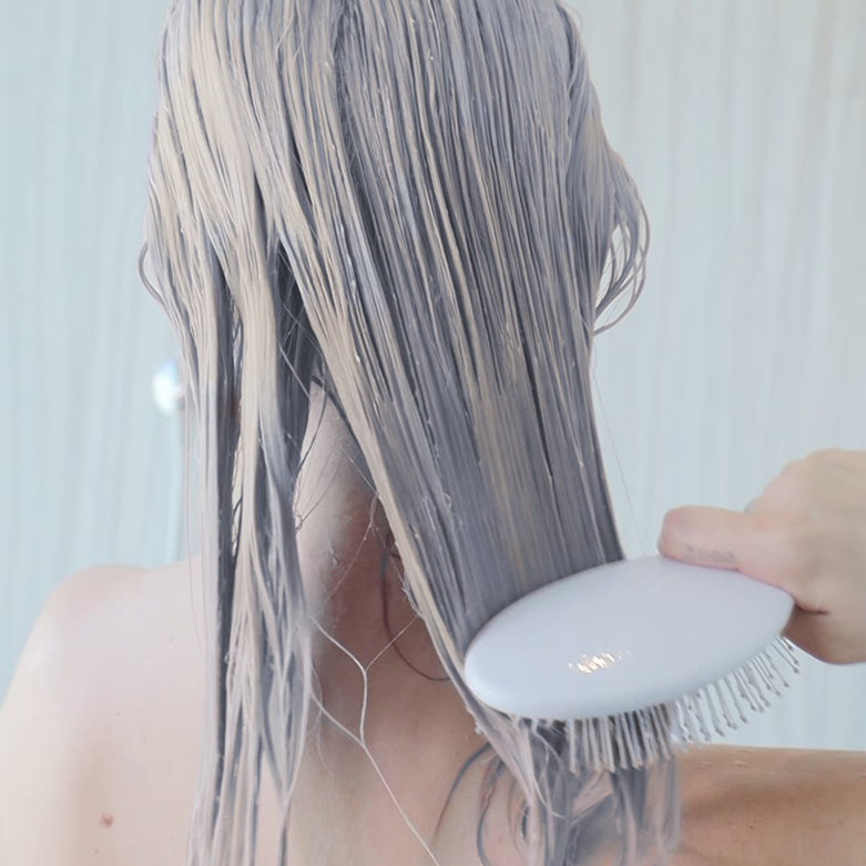 Apply evenly from roots to ends, on clean, damp hair, brushing through to evenly saturate hair.