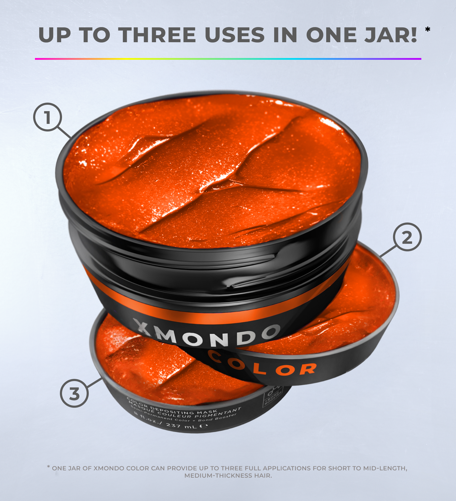 One jar of XMONDO Color typically gives 2-3 applications, depending on your hair’s length and thickness.