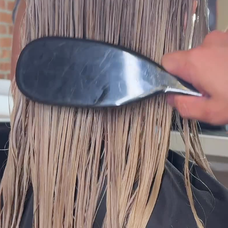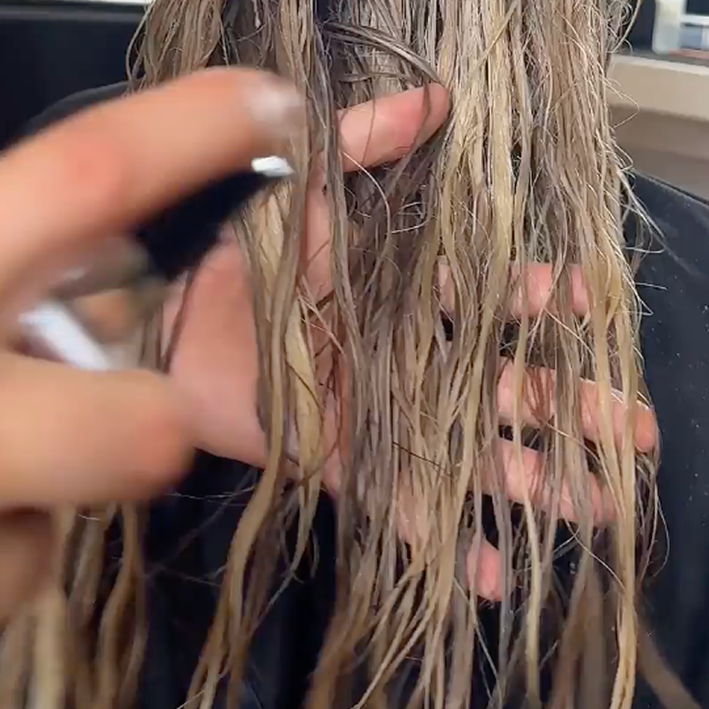 Spray 12 inches away to evenly coat damp hair.