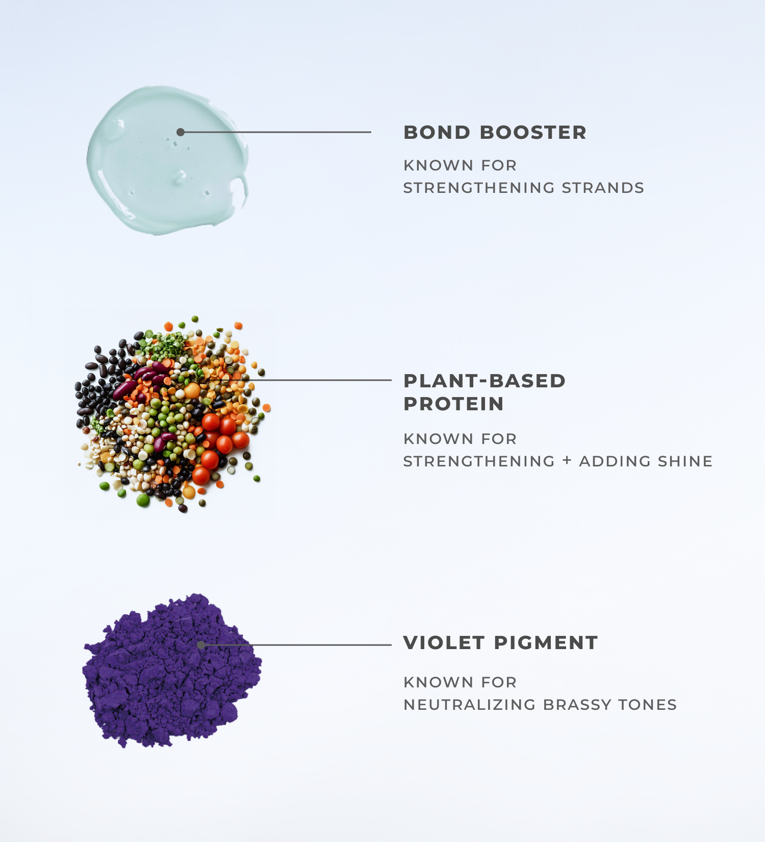 A radiance-boosting complex infused with violet pigments to neutralize brassiness and restore luminosity—leaving hair visibly brighter, cooler, and full of light-reflecting shine.